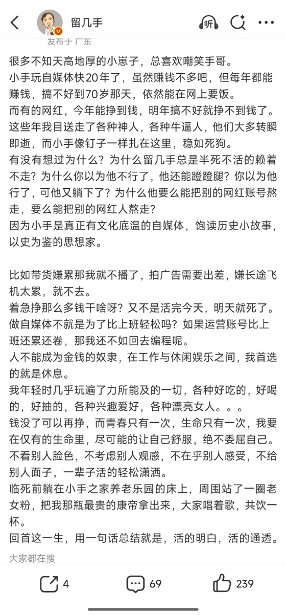 葛夕的爆料,让留几手的人设彻底崩塌,网友们终于看清他“卖惨博同情”的真面目。要知道,留几手早年凭借“毒舌点评”走红,靠着犀利甚至刻薄的言论圈粉,也曾一度成为初代网红中的代表人物,但人民日报早在2013年就曾公开发文批评他“为出名丧失底线”,语言极尽污蔑调侃之能事。近年来,随着热度下滑,他愈发剑走偏锋,靠着碰瓷、卖惨、发表争议言论走“黑红”路线,试图挽回热度。