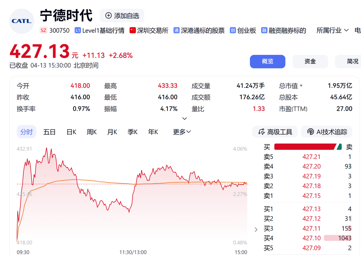 第二件是4月13日宁德时代A股盘中涨超3.6%,股价创下历史新高,其港股同步上扬烬2%,至此,宁德时代总市值首次突破2万亿元人民币。