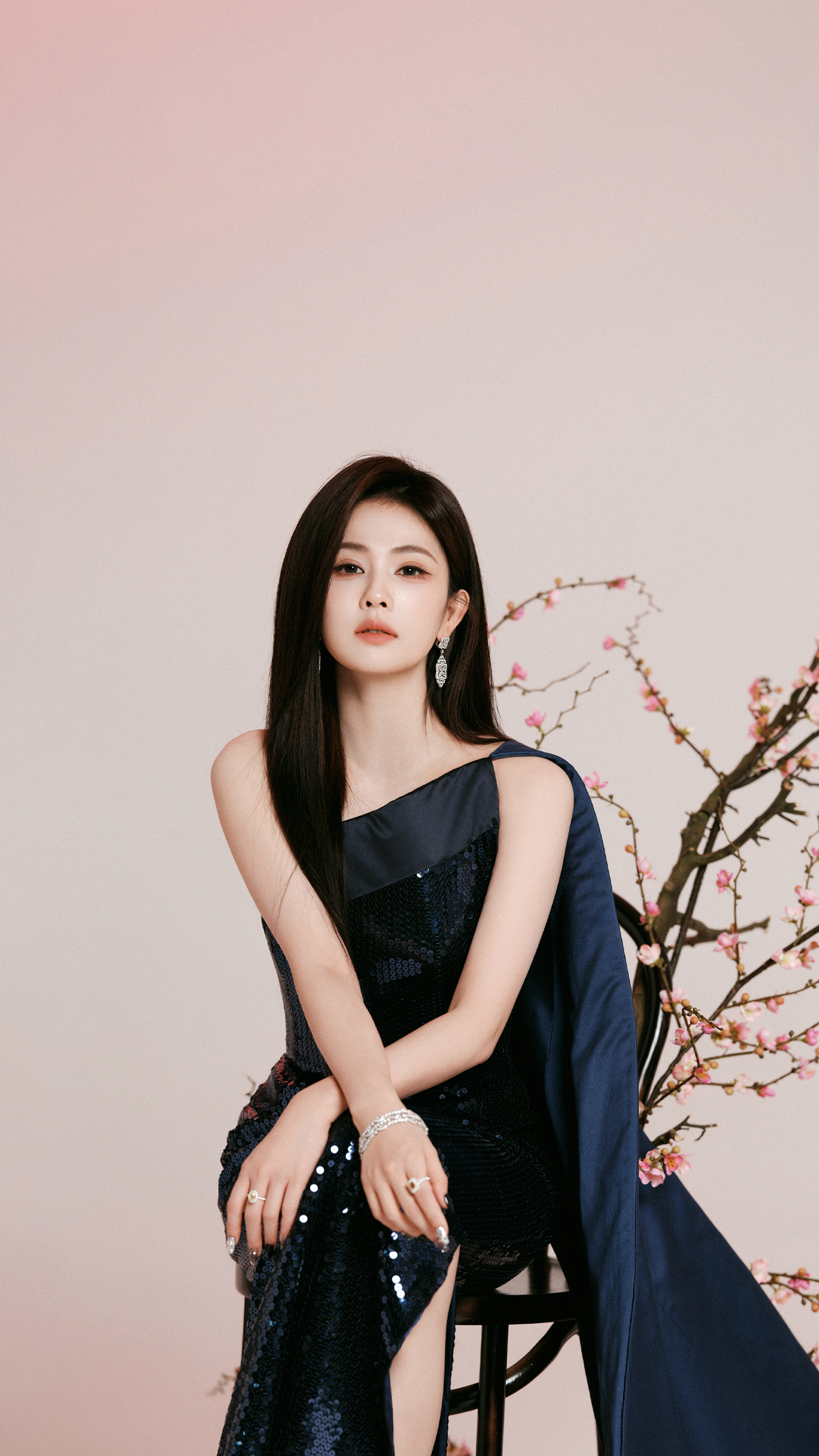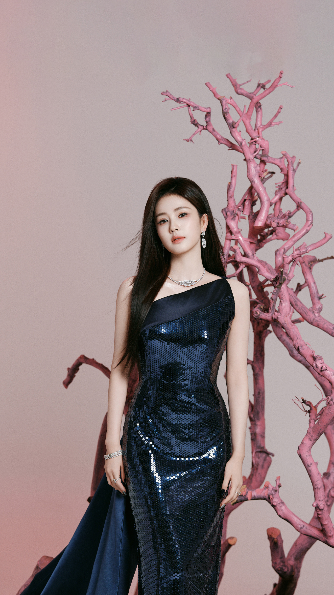 单肩设计干净利落,毫不拖泥带水,直接把她的肩颈线条勾勒得又直又绝,说是“人间衣架子”都算保守了。而裙身上那些密密麻麻的亮片,可不是随便缝上去凑数的,它们在灯光下一闪一闪,仿佛无数颗小星星在悄悄对她眨眼睛。走动之间,光影流转,优雅中带着一股“老娘不好惹”的气场,温柔与力量感拿捏得死死的,连空气都自动为她让道。